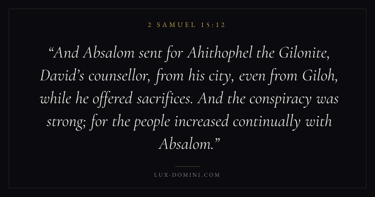 And Absalom sent for Ahithophel the Gilonite, David’s counsellor, from his city, even from Giloh, while he offered sacrifices. And the conspiracy was strong; for the people increased continually with Absalom.