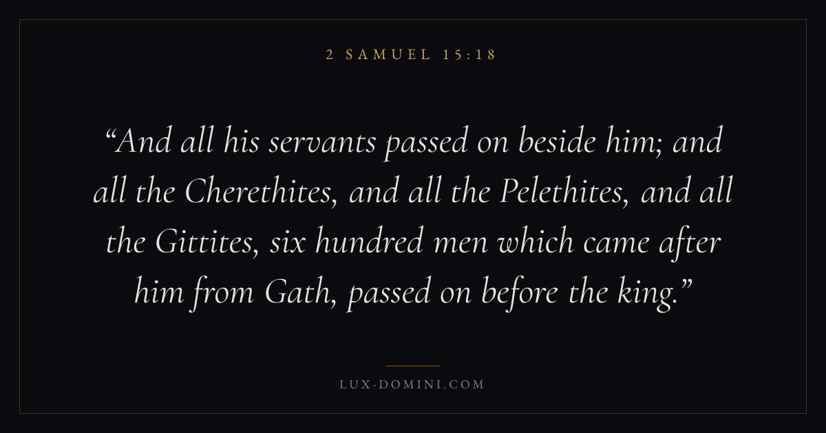 And all his servants passed on beside him; and all the Cherethites, and all the Pelethites, and all the Gittites, six hundred men which came after him from Gath, passed on before the king.