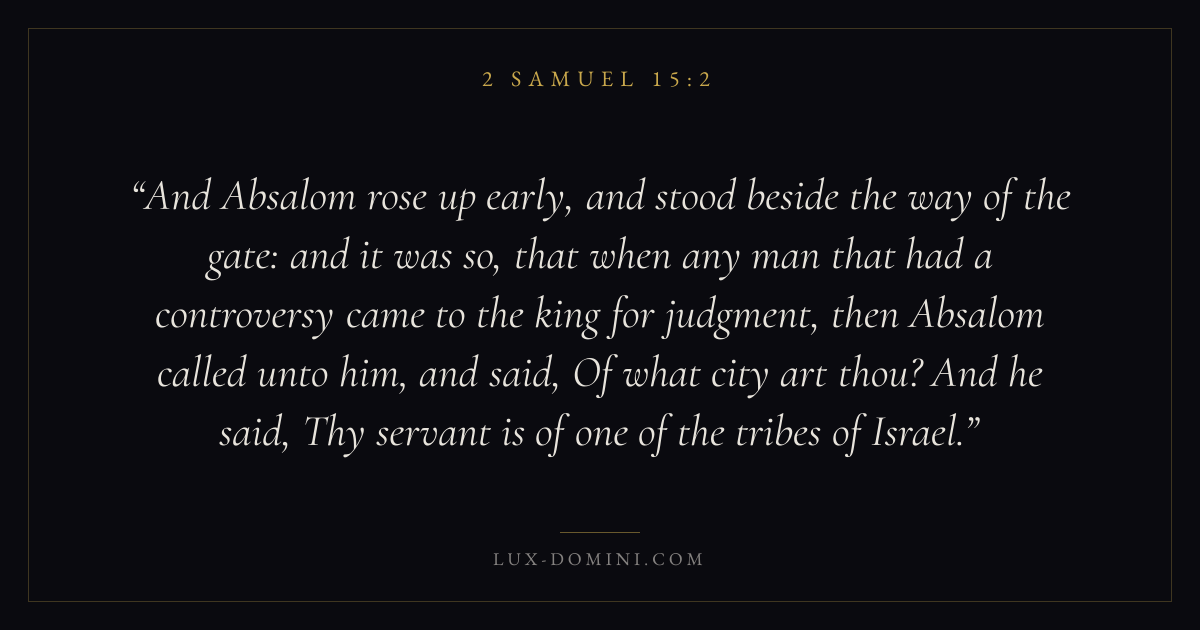 And Absalom rose up early, and stood beside the way of the gate: and it was so, that when any man that had a controversy came to the king for judgment, then Absalom called unto him, and said, Of what city art thou? And he said, Thy servant is of one of the tribes of Israel.