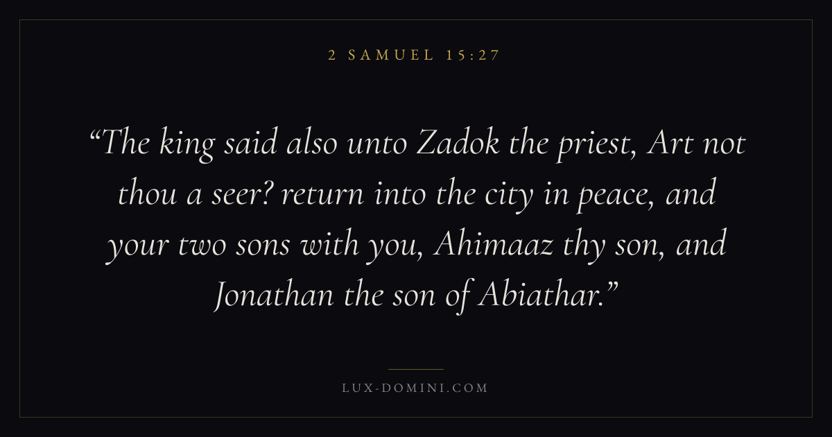 The king said also unto Zadok the priest, Art not thou a seer? return into the city in peace, and your two sons with you, Ahimaaz thy son, and Jonathan the son of Abiathar.
