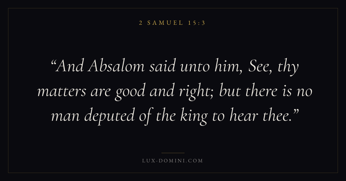 And Absalom said unto him, See, thy matters are good and right; but there is no man deputed of the king to hear thee.