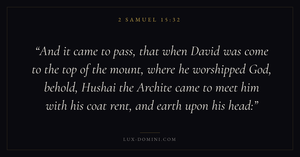 And it came to pass, that when David was come to the top of the mount, where he worshipped God, behold, Hushai the Archite came to meet him with his coat rent, and earth upon his head: