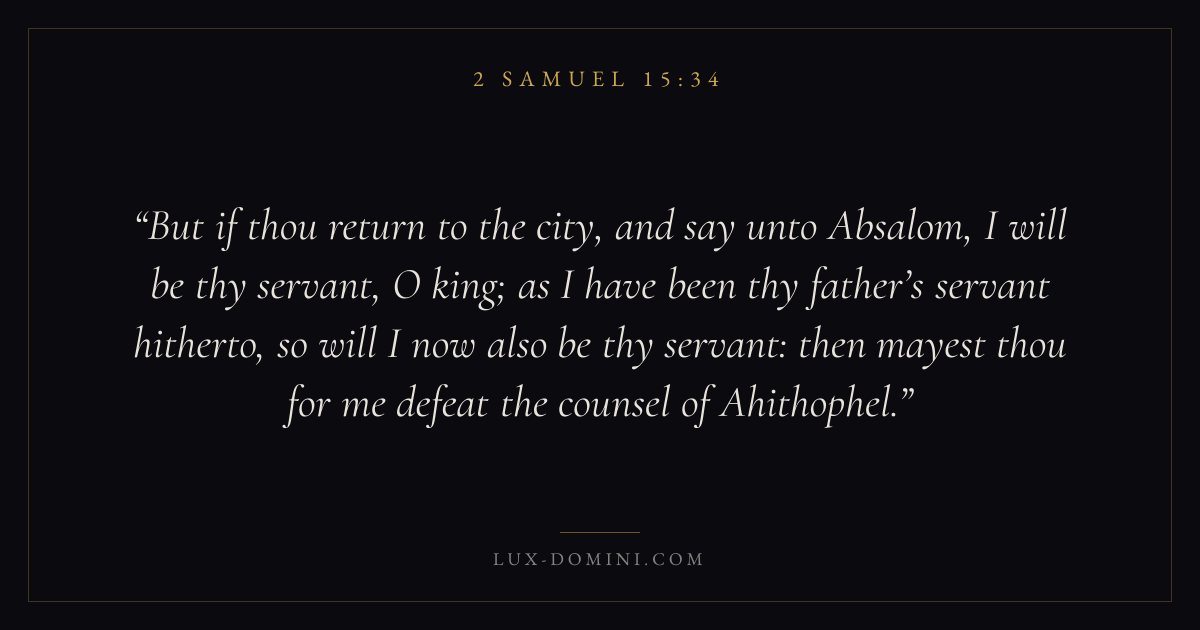 But if thou return to the city, and say unto Absalom, I will be thy servant, O king; as I have been thy father’s servant hitherto, so will I now also be thy servant: then mayest thou for me defeat the counsel of Ahithophel.