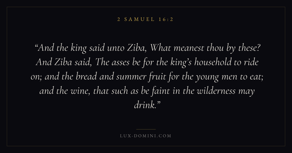 And the king said unto Ziba, What meanest thou by these? And Ziba said, The asses be for the king’s household to ride on; and the bread and summer fruit for the young men to eat; and the wine, that such as be faint in the wilderness may drink.