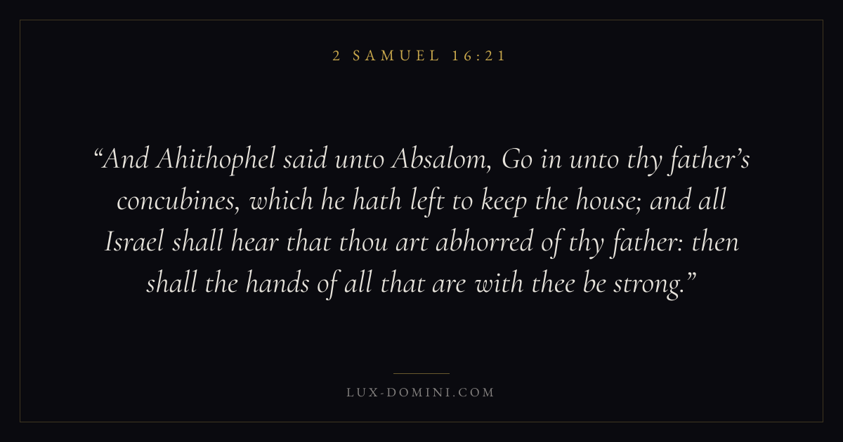 And Ahithophel said unto Absalom, Go in unto thy father’s concubines, which he hath left to keep the house; and all Israel shall hear that thou art abhorred of thy father: then shall the hands of all that are with thee be strong.