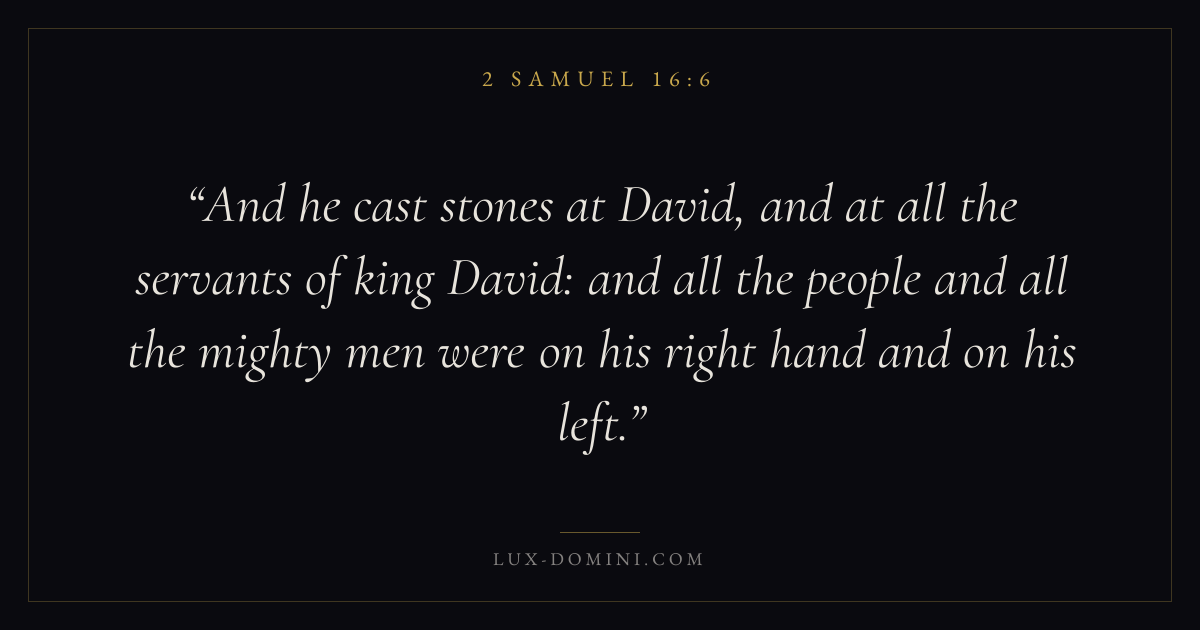 And he cast stones at David, and at all the servants of king David: and all the people and all the mighty men were on his right hand and on his left.