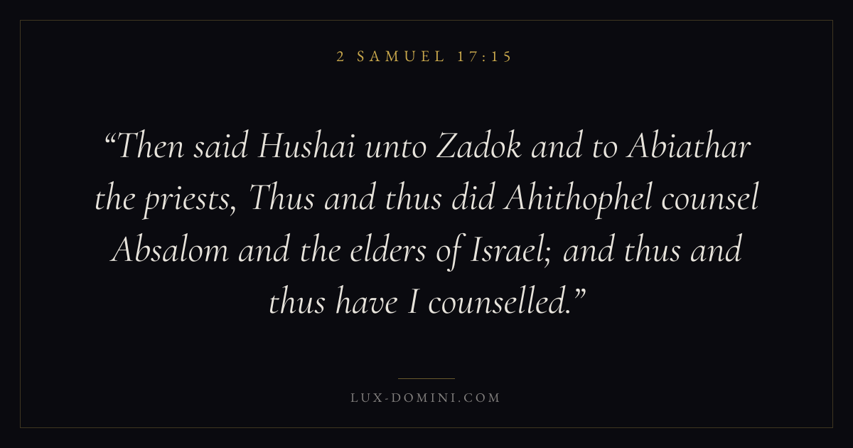 Then said Hushai unto Zadok and to Abiathar the priests, Thus and thus did Ahithophel counsel Absalom and the elders of Israel; and thus and thus have I counselled.