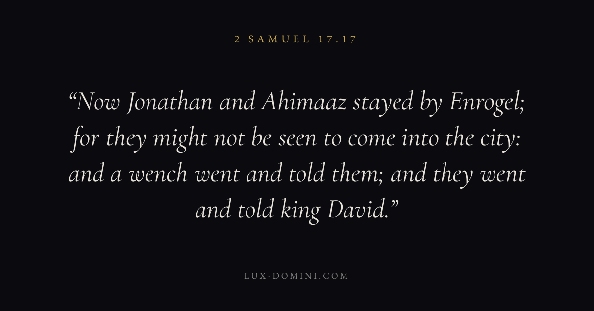 Now Jonathan and Ahimaaz stayed by Enrogel; for they might not be seen to come into the city: and a wench went and told them; and they went and told king David.
