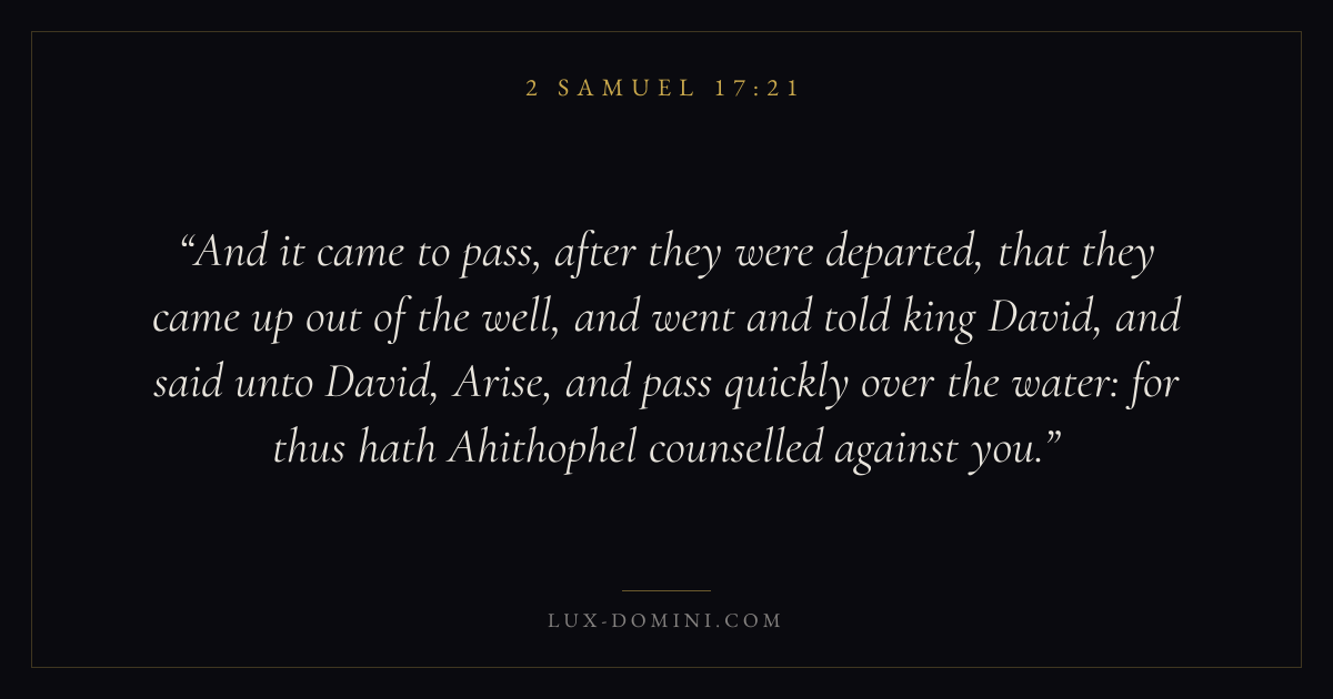 And it came to pass, after they were departed, that they came up out of the well, and went and told king David, and said unto David, Arise, and pass quickly over the water: for thus hath Ahithophel counselled against you.