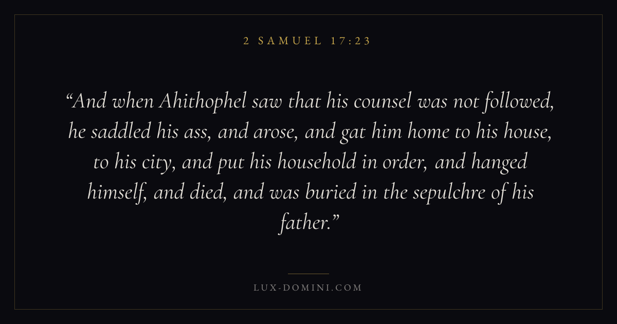 And when Ahithophel saw that his counsel was not followed, he saddled his ass, and arose, and gat him home to his house, to his city, and put his household in order, and hanged himself, and died, and was buried in the sepulchre of his father.