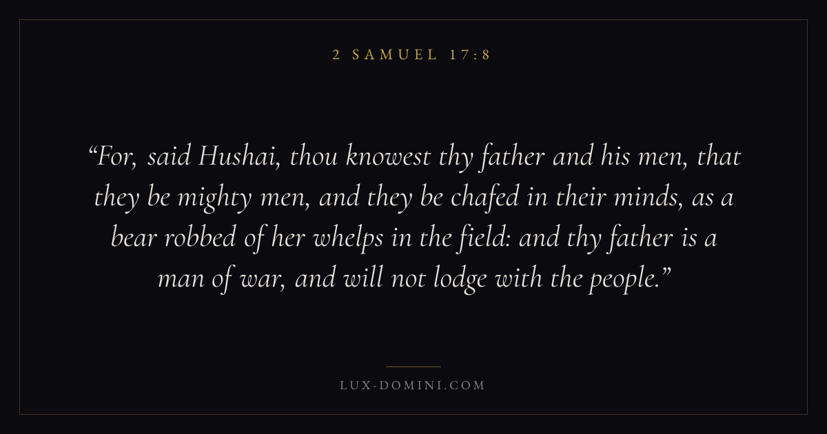 For, said Hushai, thou knowest thy father and his men, that they be mighty men, and they be chafed in their minds, as a bear robbed of her whelps in the field: and thy father is a man of war, and will not lodge with the people.