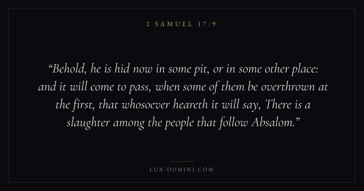 Behold, he is hid now in some pit, or in some other place: and it will come to pass, when some of them be overthrown at the first, that whosoever heareth it will say, There is a slaughter among the people that follow Absalom.