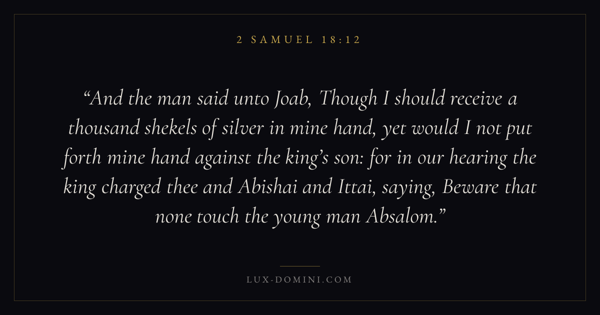 And the man said unto Joab, Though I should receive a thousand shekels of silver in mine hand, yet would I not put forth mine hand against the king’s son: for in our hearing the king charged thee and Abishai and Ittai, saying, Beware that none touch the young man Absalom.