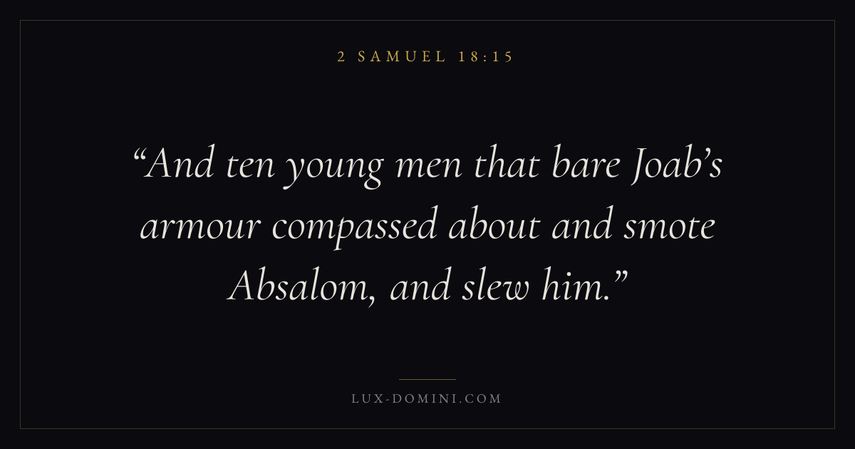 And ten young men that bare Joab’s armour compassed about and smote Absalom, and slew him.