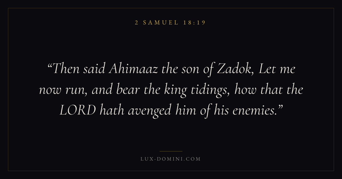 Then said Ahimaaz the son of Zadok, Let me now run, and bear the king tidings, how that the LORD hath avenged him of his enemies.