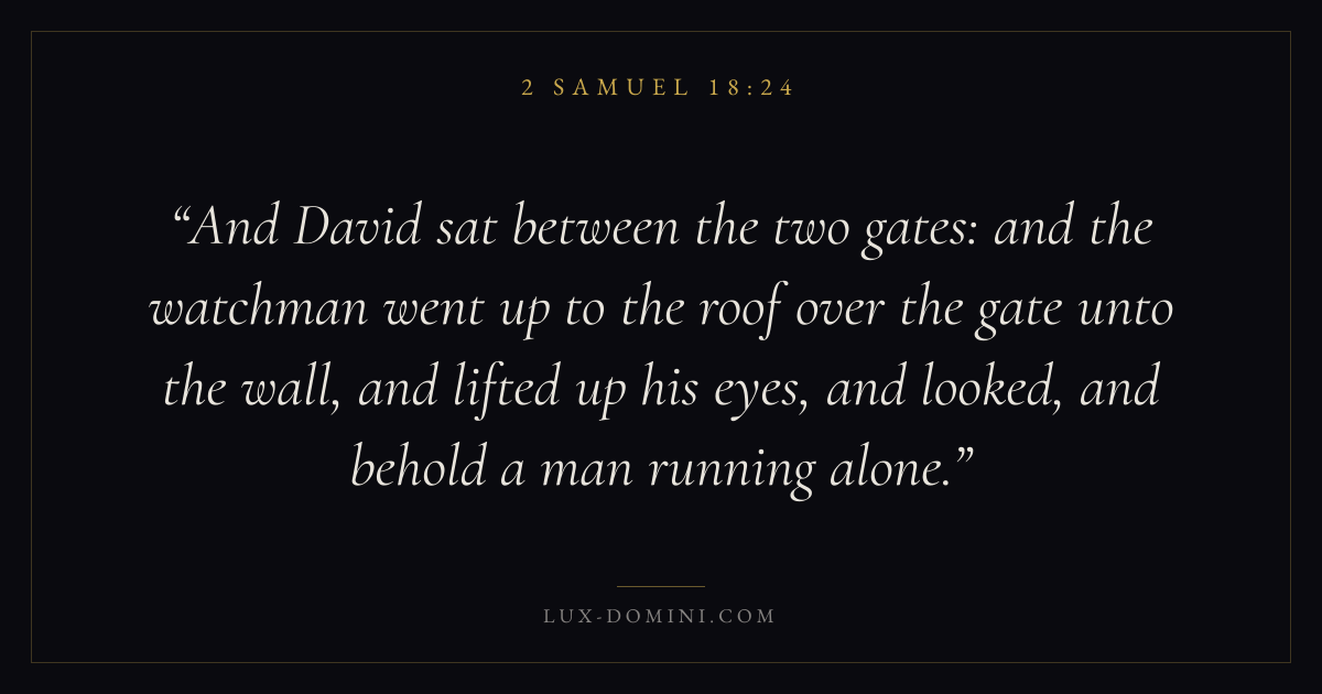 And David sat between the two gates: and the watchman went up to the roof over the gate unto the wall, and lifted up his eyes, and looked, and behold a man running alone.