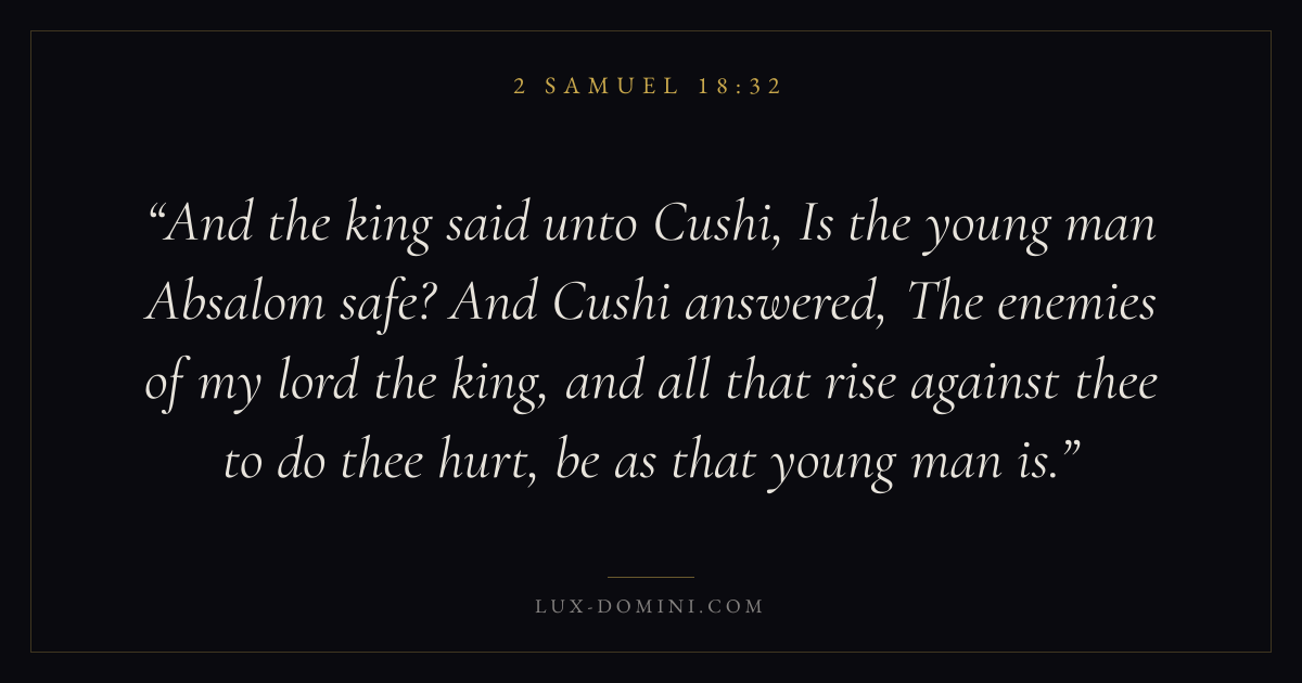 And the king said unto Cushi, Is the young man Absalom safe? And Cushi answered, The enemies of my lord the king, and all that rise against thee to do thee hurt, be as that young man is.
