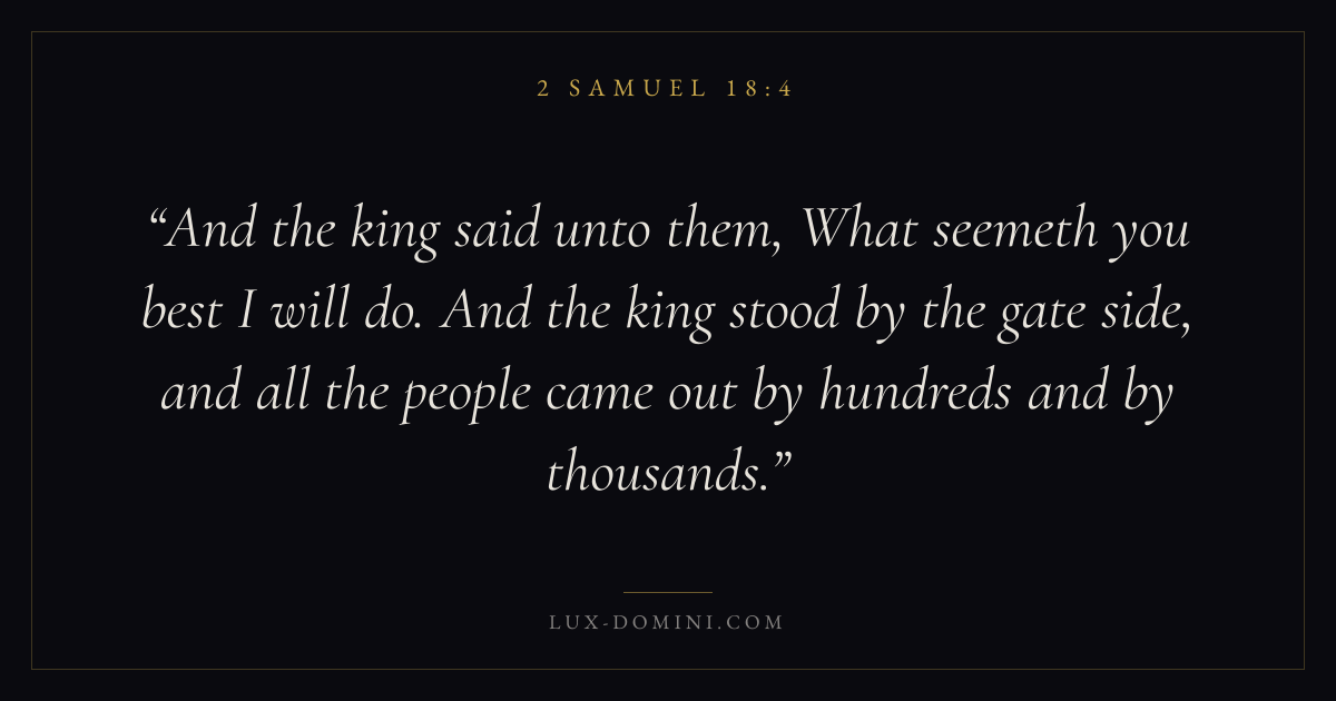 And the king said unto them, What seemeth you best I will do. And the king stood by the gate side, and all the people came out by hundreds and by thousands.