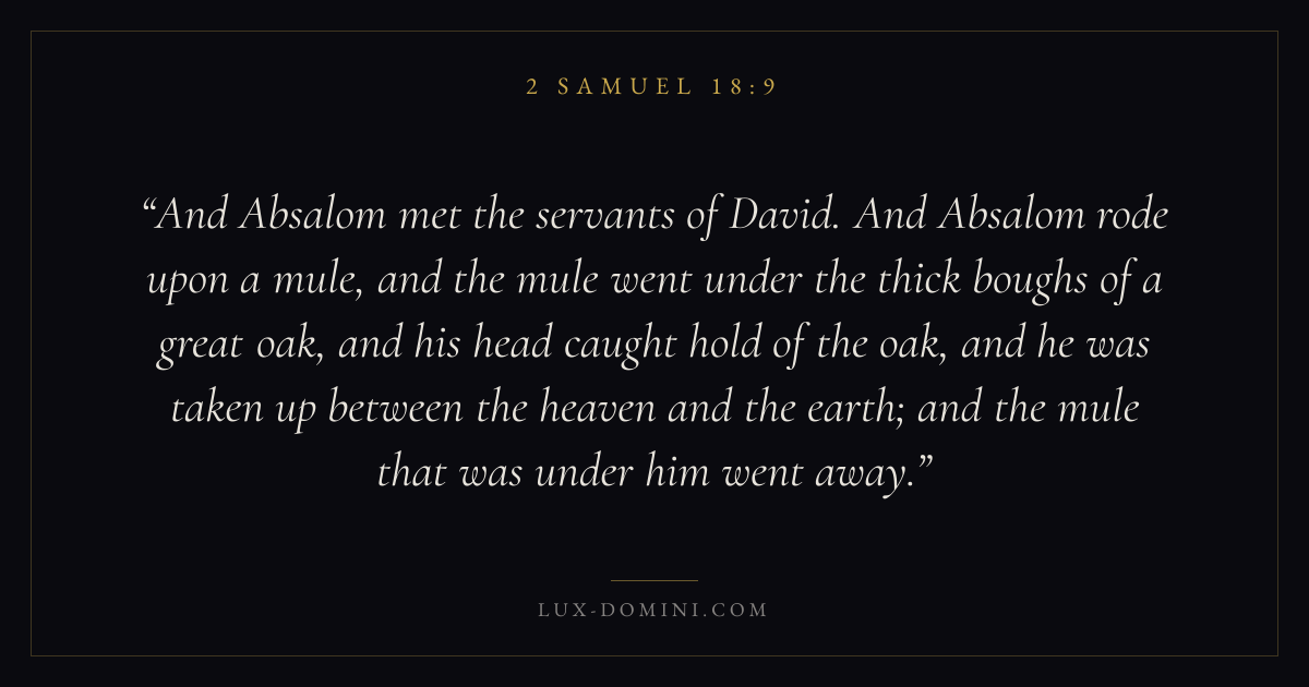 And Absalom met the servants of David. And Absalom rode upon a mule, and the mule went under the thick boughs of a great oak, and his head caught hold of the oak, and he was taken up between the heaven and the earth; and the mule that was under him went away.