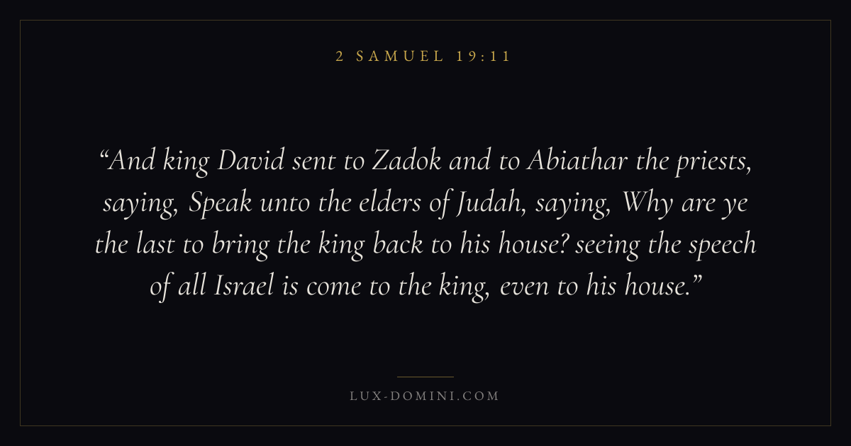And king David sent to Zadok and to Abiathar the priests, saying, Speak unto the elders of Judah, saying, Why are ye the last to bring the king back to his house? seeing the speech of all Israel is come to the king, even to his house.