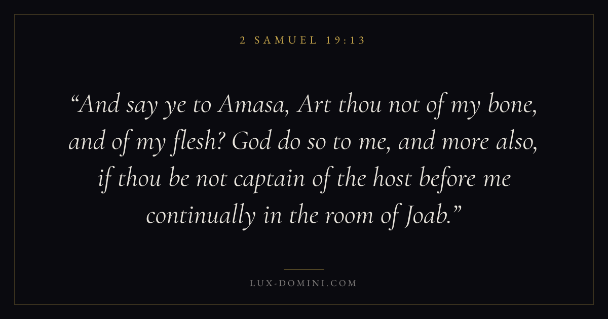 And say ye to Amasa, Art thou not of my bone, and of my flesh? God do so to me, and more also, if thou be not captain of the host before me continually in the room of Joab.