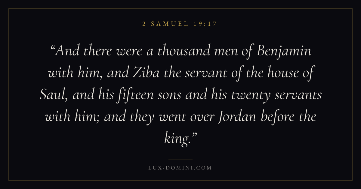 And there were a thousand men of Benjamin with him, and Ziba the servant of the house of Saul, and his fifteen sons and his twenty servants with him; and they went over Jordan before the king.
