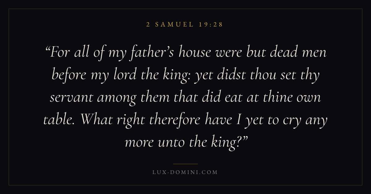 For all of my father’s house were but dead men before my lord the king: yet didst thou set thy servant among them that did eat at thine own table. What right therefore have I yet to cry any more unto the king?