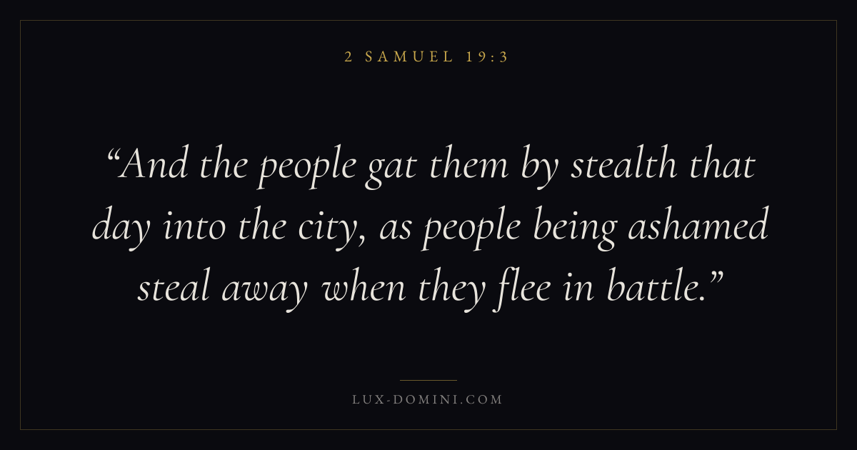 And the people gat them by stealth that day into the city, as people being ashamed steal away when they flee in battle.