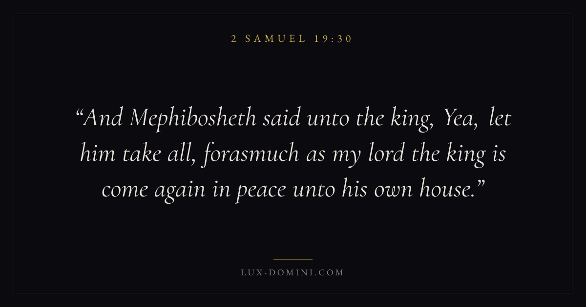 And Mephibosheth said unto the king, Yea, let him take all, forasmuch as my lord the king is come again in peace unto his own house.