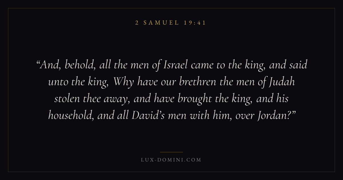 And, behold, all the men of Israel came to the king, and said unto the king, Why have our brethren the men of Judah stolen thee away, and have brought the king, and his household, and all David’s men with him, over Jordan?