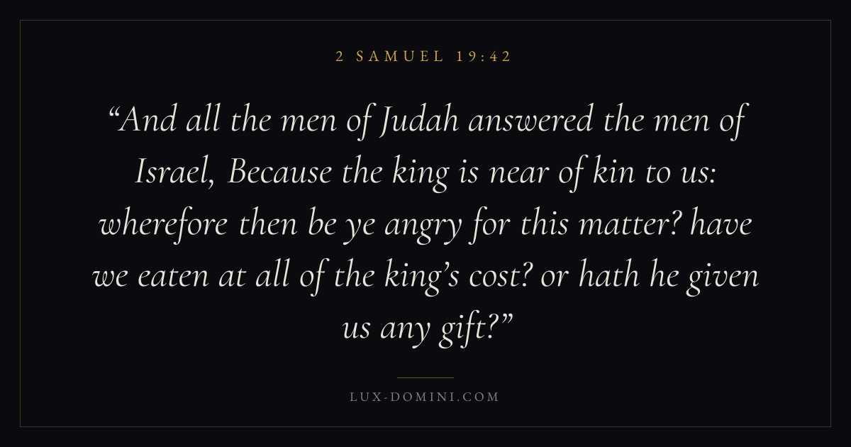 And all the men of Judah answered the men of Israel, Because the king is near of kin to us: wherefore then be ye angry for this matter? have we eaten at all of the king’s cost? or hath he given us any gift?