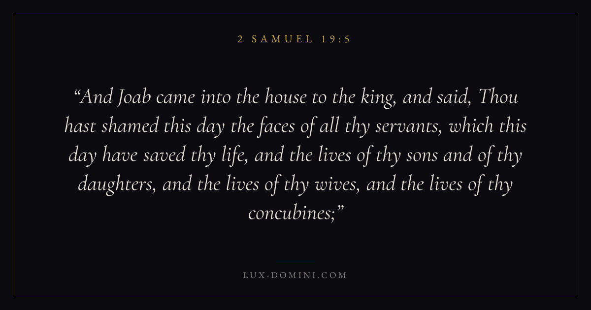 And Joab came into the house to the king, and said, Thou hast shamed this day the faces of all thy servants, which this day have saved thy life, and the lives of thy sons and of thy daughters, and the lives of thy wives, and the lives of thy concubines;