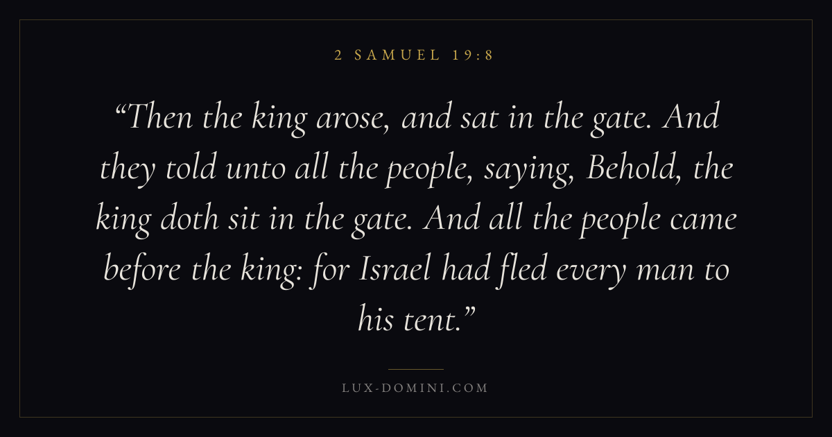 Then the king arose, and sat in the gate. And they told unto all the people, saying, Behold, the king doth sit in the gate. And all the people came before the king: for Israel had fled every man to his tent.