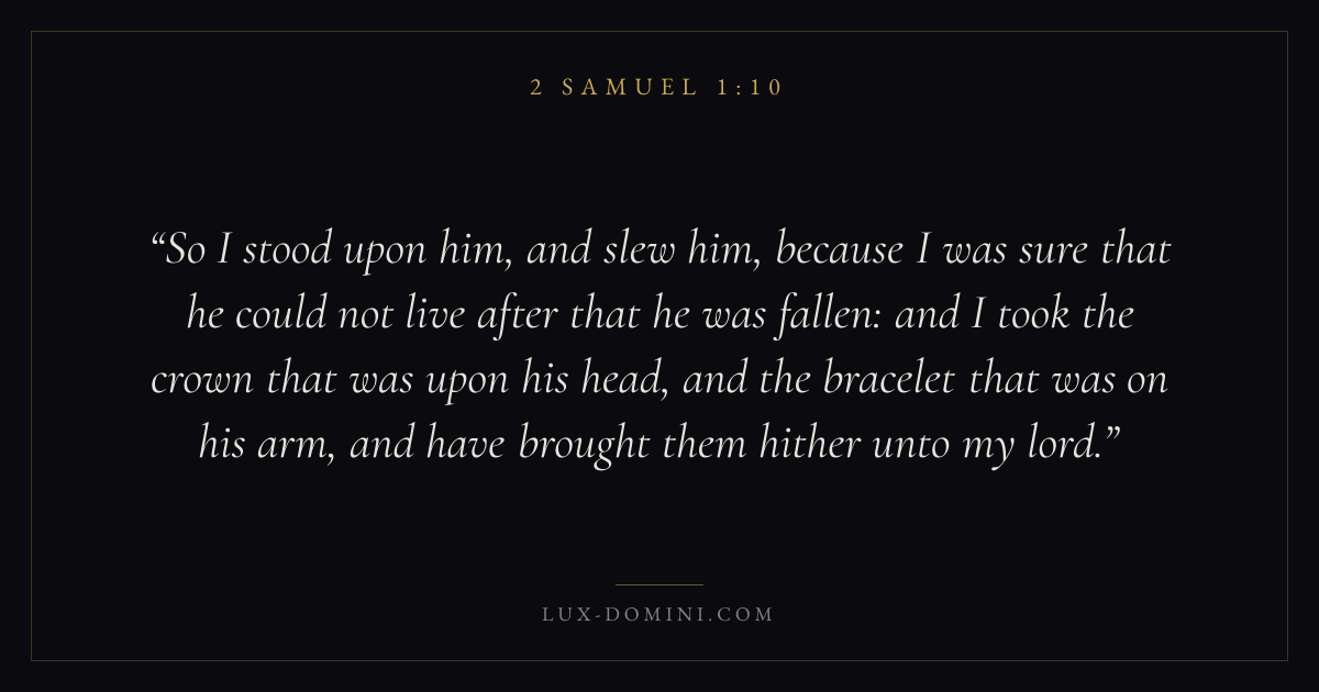 So I stood upon him, and slew him, because I was sure that he could not live after that he was fallen: and I took the crown that was upon his head, and the bracelet that was on his arm, and have brought them hither unto my lord.
