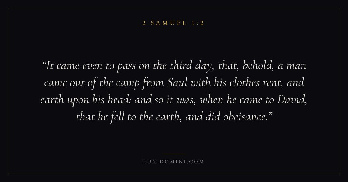 It came even to pass on the third day, that, behold, a man came out of the camp from Saul with his clothes rent, and earth upon his head: and so it was, when he came to David, that he fell to the earth, and did obeisance.
