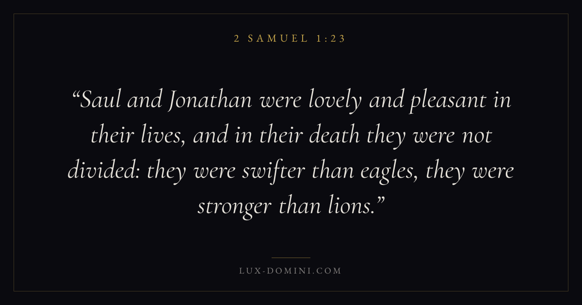 Saul and Jonathan were lovely and pleasant in their lives, and in their death they were not divided: they were swifter than eagles, they were stronger than lions.