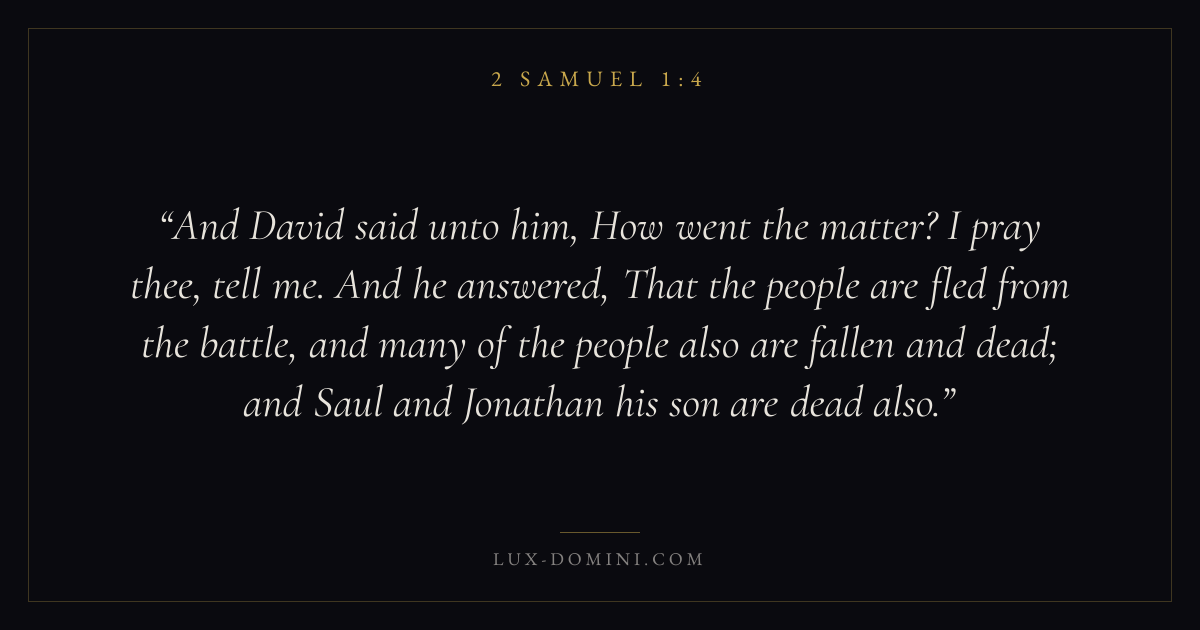 And David said unto him, How went the matter? I pray thee, tell me. And he answered, That the people are fled from the battle, and many of the people also are fallen and dead; and Saul and Jonathan his son are dead also.