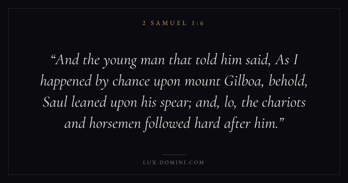 And the young man that told him said, As I happened by chance upon mount Gilboa, behold, Saul leaned upon his spear; and, lo, the chariots and horsemen followed hard after him.