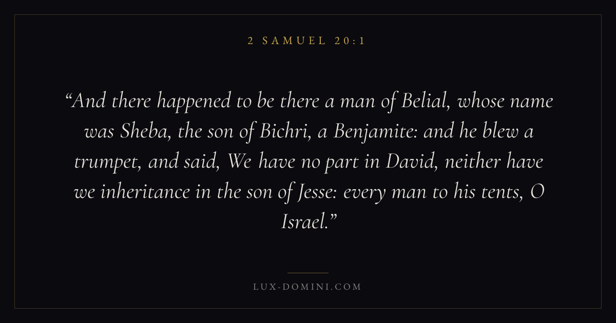 And there happened to be there a man of Belial, whose name was Sheba, the son of Bichri, a Benjamite: and he blew a trumpet, and said, We have no part in David, neither have we inheritance in the son of Jesse: every man to his tents, O Israel.