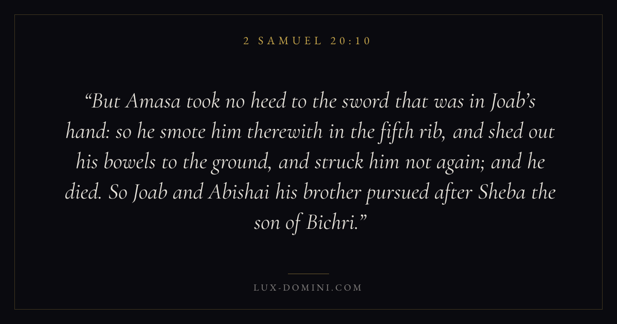 But Amasa took no heed to the sword that was in Joab’s hand: so he smote him therewith in the fifth rib, and shed out his bowels to the ground, and struck him not again; and he died. So Joab and Abishai his brother pursued after Sheba the son of Bichri.