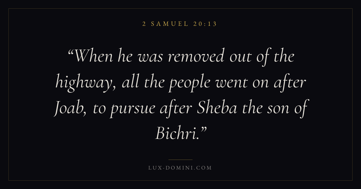When he was removed out of the highway, all the people went on after Joab, to pursue after Sheba the son of Bichri.