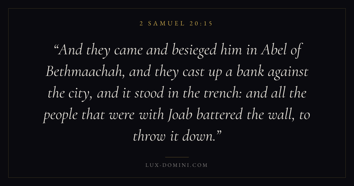 And they came and besieged him in Abel of Bethmaachah, and they cast up a bank against the city, and it stood in the trench: and all the people that were with Joab battered the wall, to throw it down.