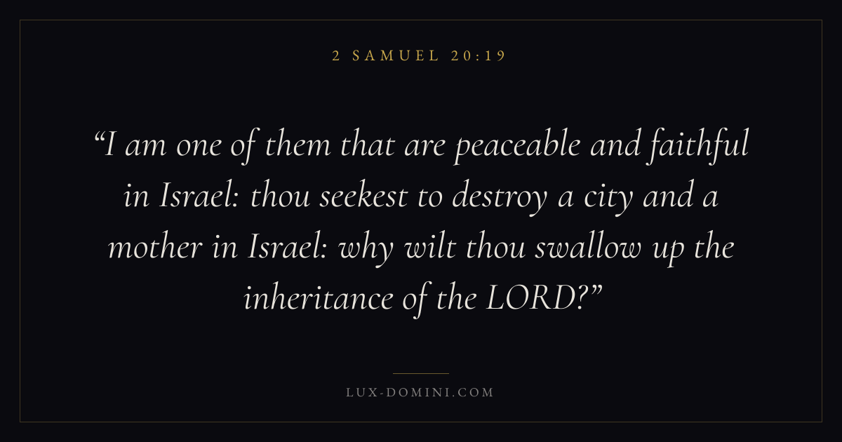 I am one of them that are peaceable and faithful in Israel: thou seekest to destroy a city and a mother in Israel: why wilt thou swallow up the inheritance of the LORD?