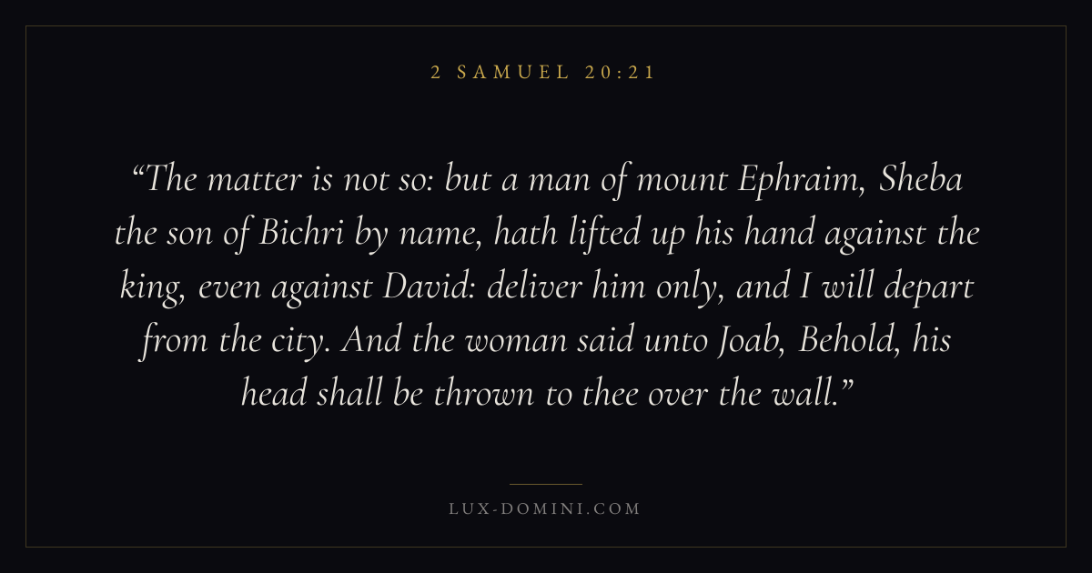 The matter is not so: but a man of mount Ephraim, Sheba the son of Bichri by name, hath lifted up his hand against the king, even against David: deliver him only, and I will depart from the city. And the woman said unto Joab, Behold, his head shall be thrown to thee over the wall.