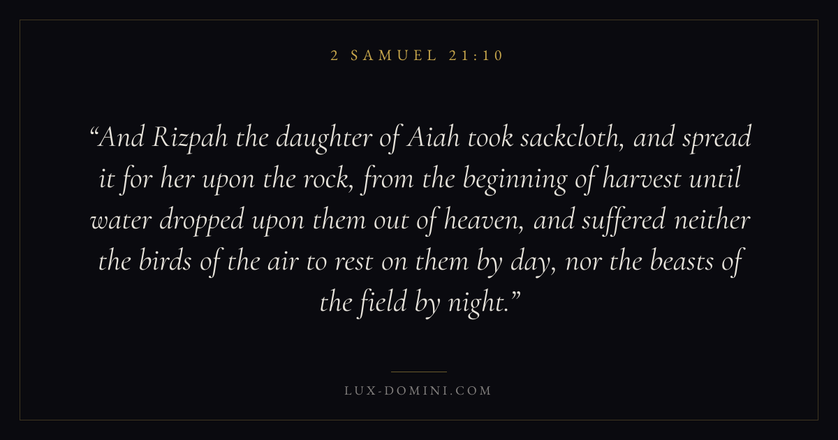 And Rizpah the daughter of Aiah took sackcloth, and spread it for her upon the rock, from the beginning of harvest until water dropped upon them out of heaven, and suffered neither the birds of the air to rest on them by day, nor the beasts of the field by night.