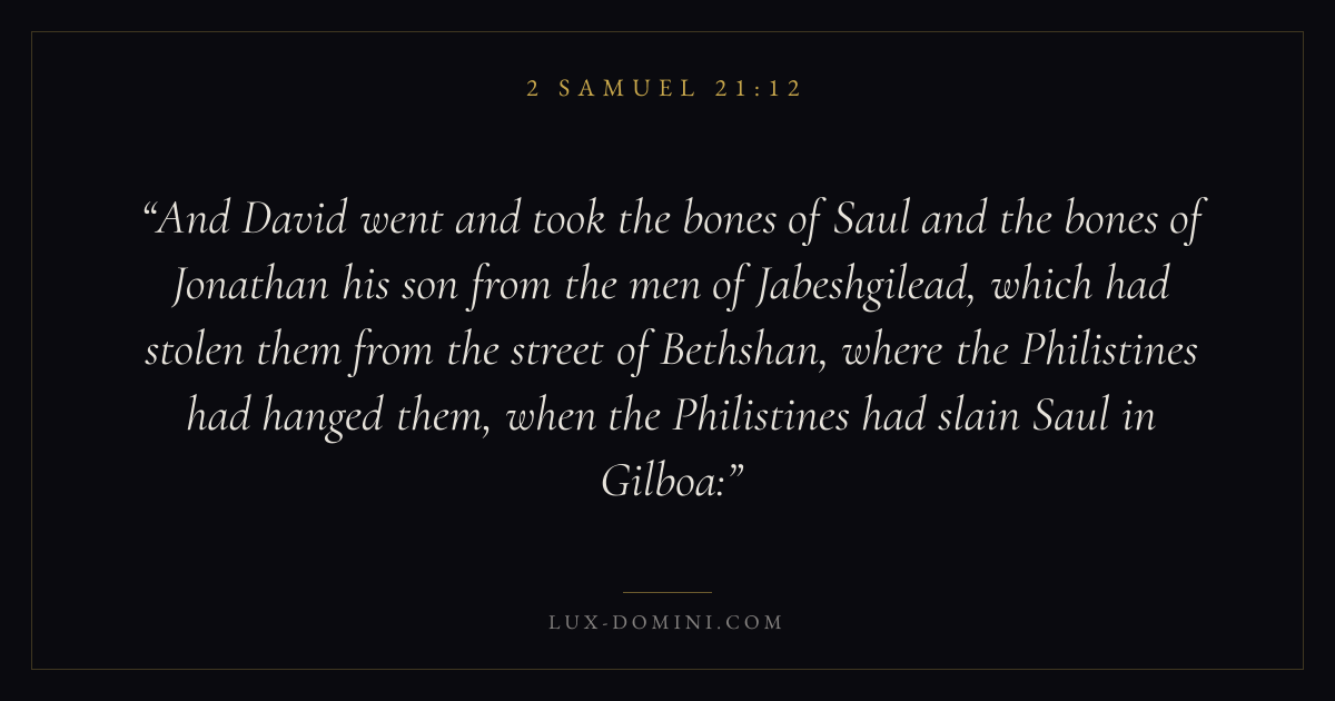 And David went and took the bones of Saul and the bones of Jonathan his son from the men of Jabeshgilead, which had stolen them from the street of Bethshan, where the Philistines had hanged them, when the Philistines had slain Saul in Gilboa: