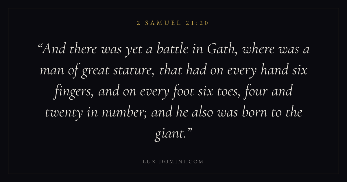 And there was yet a battle in Gath, where was a man of great stature, that had on every hand six fingers, and on every foot six toes, four and twenty in number; and he also was born to the giant.
