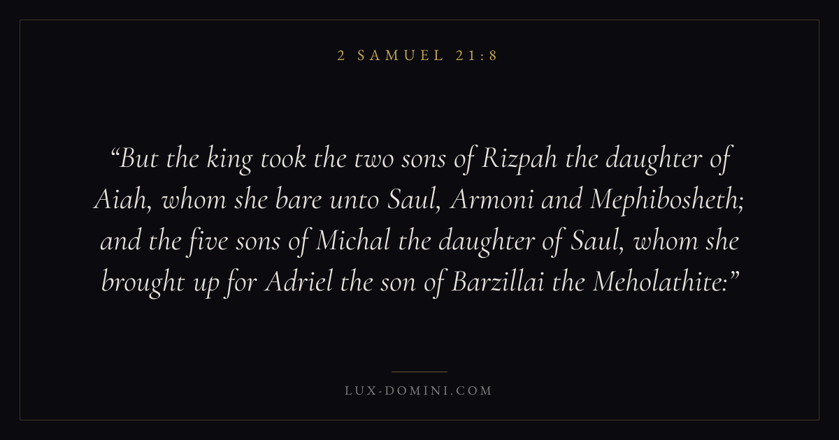 But the king took the two sons of Rizpah the daughter of Aiah, whom she bare unto Saul, Armoni and Mephibosheth; and the five sons of Michal the daughter of Saul, whom she brought up for Adriel the son of Barzillai the Meholathite: