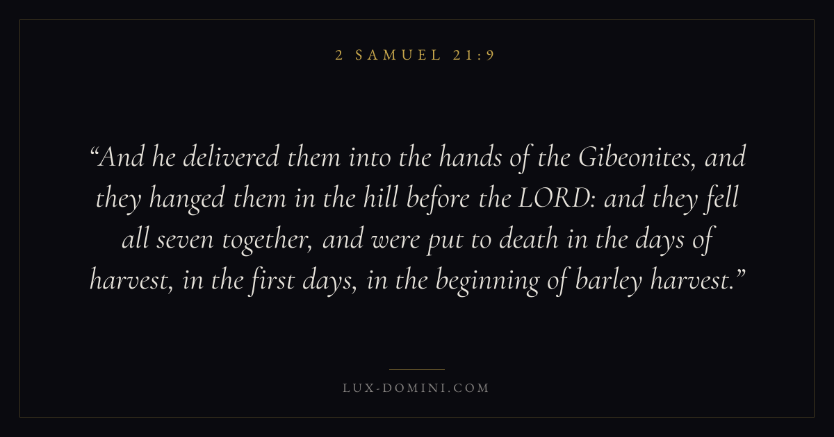 And he delivered them into the hands of the Gibeonites, and they hanged them in the hill before the LORD: and they fell all seven together, and were put to death in the days of harvest, in the first days, in the beginning of barley harvest.