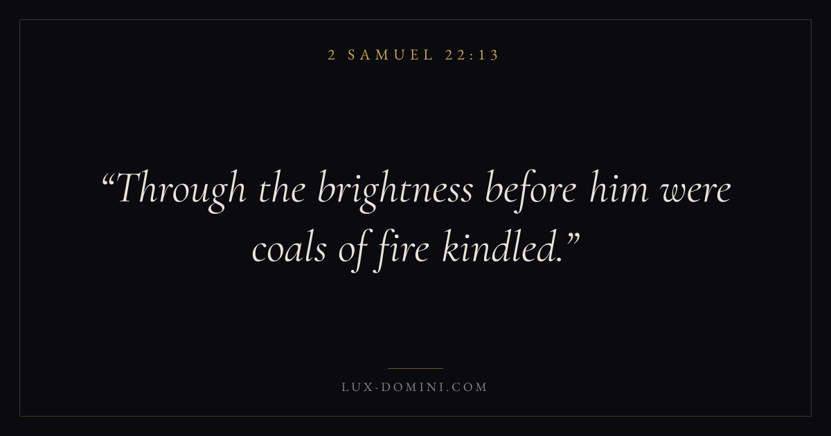 Books / 2 Samuel / Chapter 22 / Verse 13 ← 2 Samuel 22:12 2 Samuel 22:13 2 Samuel 22:14 → Through the brightness before him were coals of fire kindled. Download verse card Share on Twitter Share on Facebook Pin it ✦ Key themes Justice and mercyDavidic covenantSin and judgmentMercy Read with 2 Samuel 22:142 Samuel 22:15Micah 6:8Amos 5:24 Related topics Bible verses about justice and mercy ✦ 2 Samuel Chapter 22 verses V. 1 V. 2 V. 3 V. 4 V. 5 V. 6 V. 7 V. 8 V. 9 V. 10 V. 11 V. 12 V. 13 V. 14 V. 15 V. 16 V. 17 V. 18 V. 19 V. 20 V. 21 V. 22 V. 23 V. 24 V. 25 V. 26 V. 27 V. 28 V. 29 V. 30 V. 31 V. 32 V. 33 V. 34 V. 35 V. 36 V. 37 V. 38 V. 39 V. 40 V. 41 V. 42 V. 43 V. 44 V. 45 V. 46 V. 47 V. 48 V. 49 V. 50 V. 51